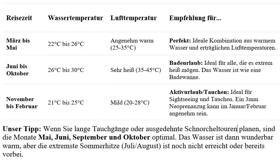 Die gute Nachricht vorweg: Die Wassertemperatur in Ägypten fällt selbst im kältesten Monat selten unter 21°C. Das macht das Rote Meer zu einem der zuverlässigsten Ganzjahres-Tauch- und Schnorchelgebiete der Welt.